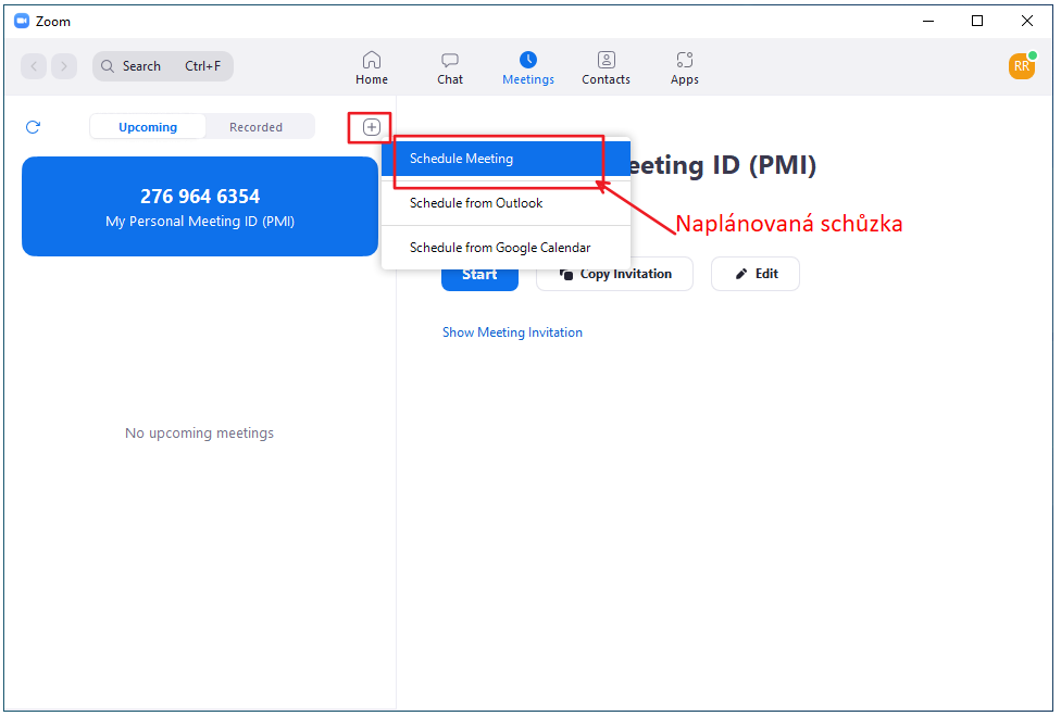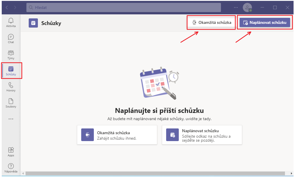 Na obrázku vlevo vidíme, že hned pod řadou ikon je tlačítko pro vytvoření nové schůzky.