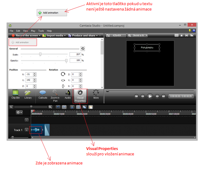 Pokud vložíme do videa nějaký text (obrázek, šipku apod.) je možné tento text rozpohybovat pomocí záložky Visual Properties (viz. obrázek níže).