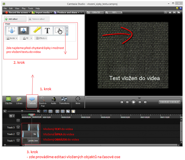 Pro vložení šipek nebo textu do videa je nutné se přepnout na záložku Callouts (popisek). Na této záložce je možné vložit do videa spoustu objektů a to:
