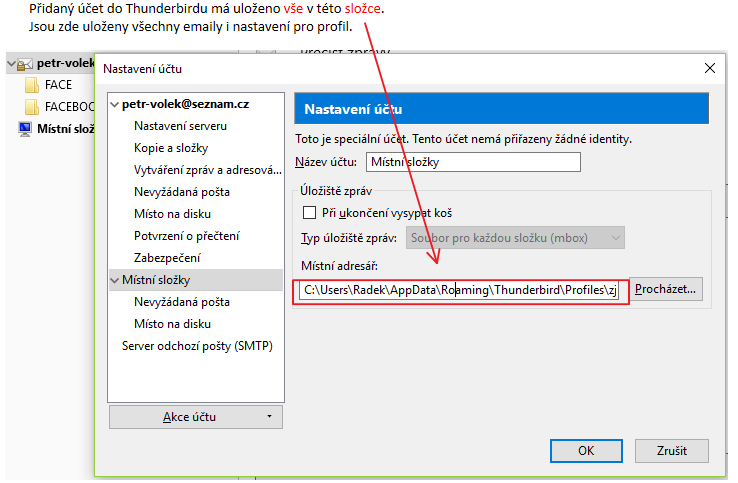 Uložené emaily a nastavení účtu v program Thunderbird: