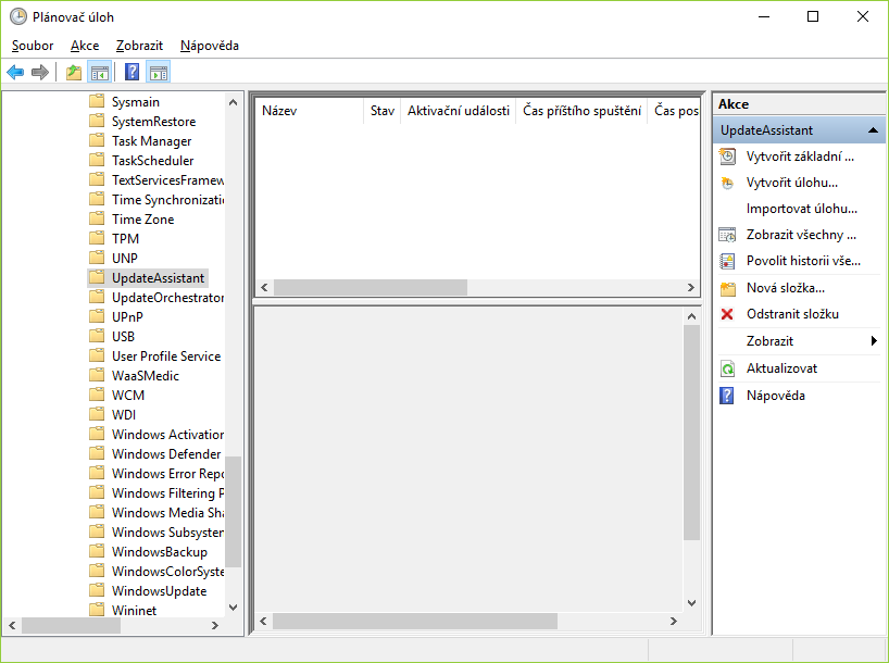 V Plánovači úloh přejdeme na Microsoft => Windows a vyhledáme Update Assistant a WindowsUpdate.