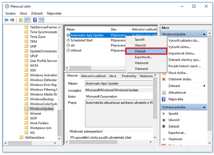 Na obrázku níže vidíme zakázaní WindowsUpdate v Plánovači úloh …